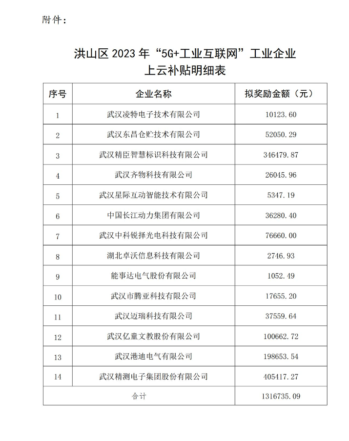 附件:洪山區(qū)2023年“5G+工業(yè)互聯(lián)網”工業(yè)企業(yè)上云補貼明細表